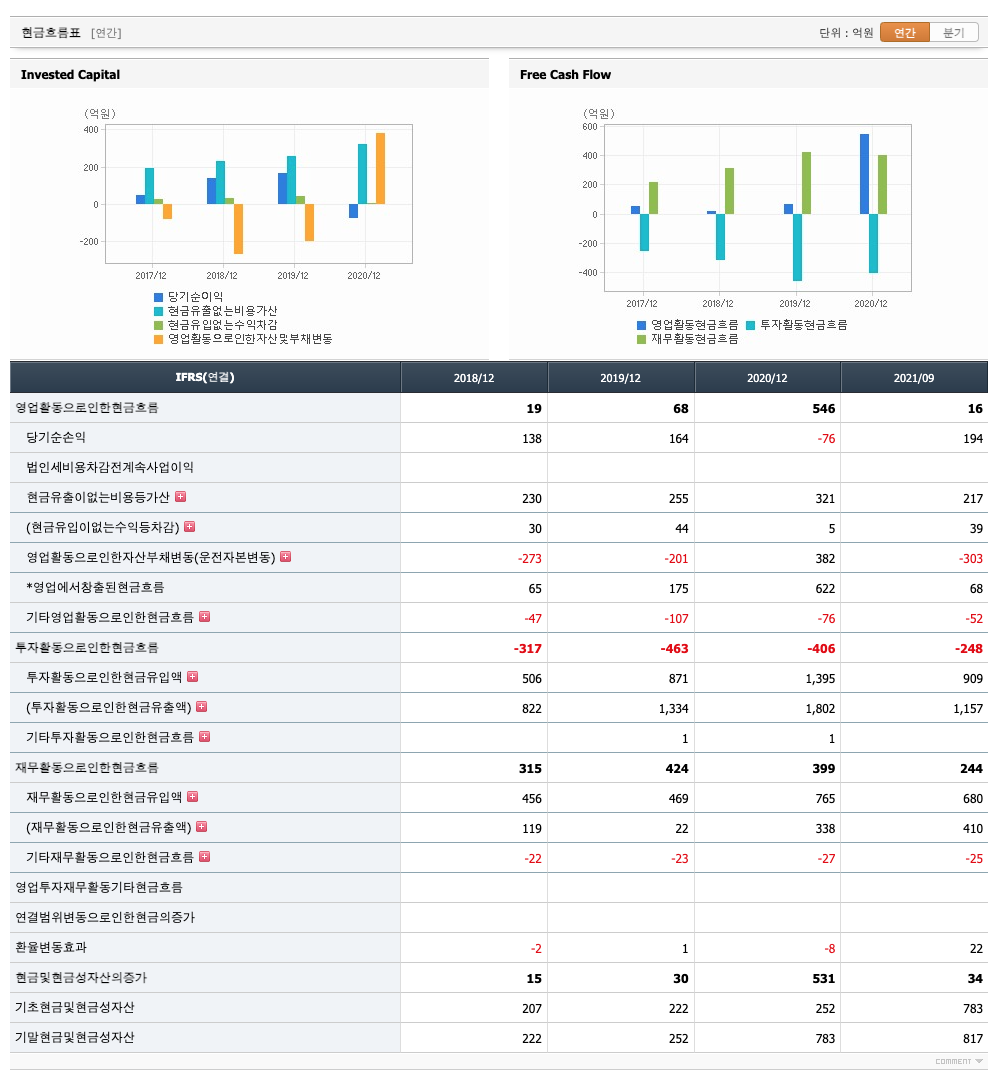 재무활동 현금흐름 : 2018년 315억원, 2019년 424억원, 2020년 399억원, 2021년 1,2,3분기 244억원으로 재무활동 현금흐름이 플러스입니다.