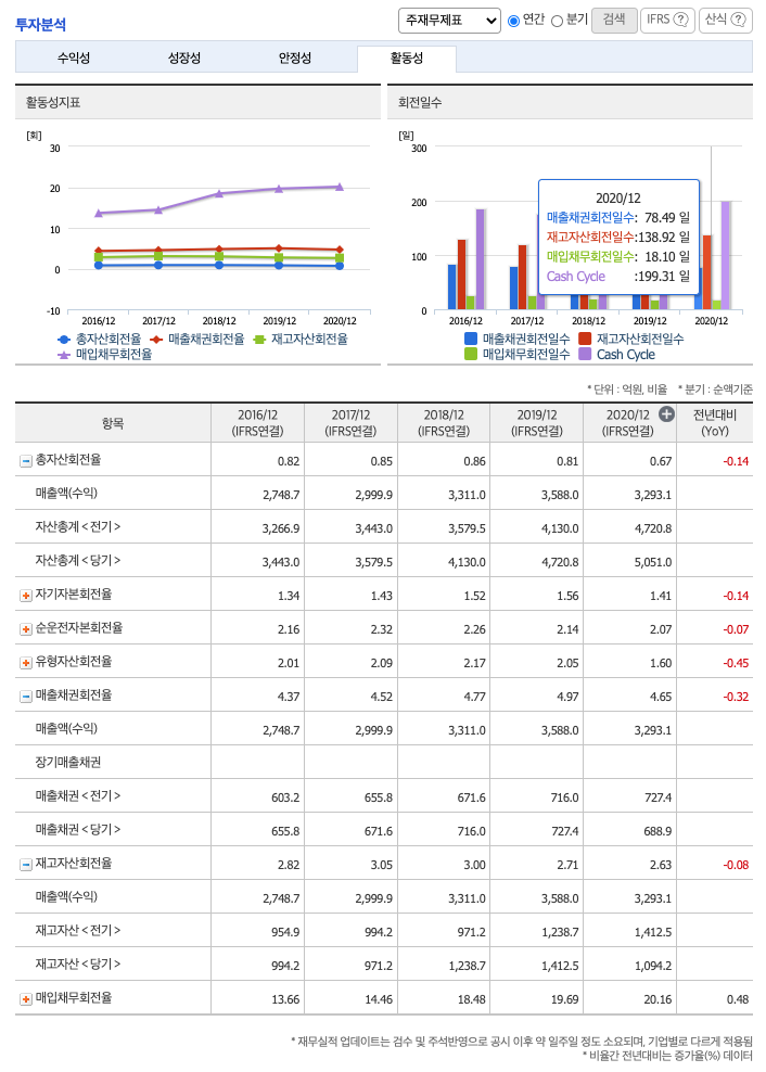 재고자산회전율(높을 수록 좋습니다) : 2018년 약 1238억원, 2019년 약 1412억원, 2020년 약 1094억원이고, 회전율은 2018년 약 3%, 2019년 약 2%, 2020년 약 2%로 안정적입니다.