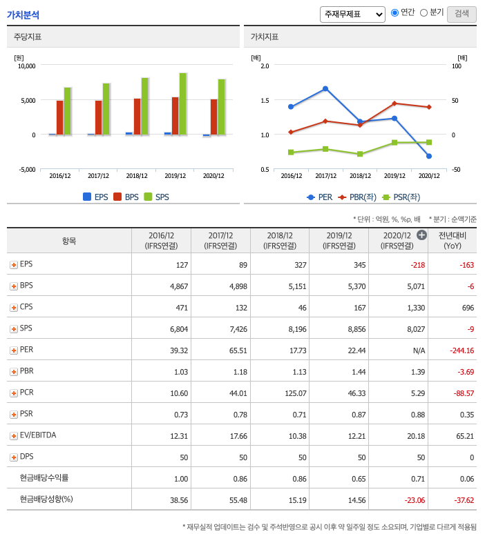 DPS(Dividend Per Share의 약자, 총배당금을 총주식발생수로 나눈 것, 한 주당 얼만큼의 배당금을 받을 수 있는지 알 수 있는 지표, DPS가 높을 수록 배당금이 많은 것임) : 2016년 50원, 2017년 50원, 2018년 50원, 2019년 50원, 2020년 50원으로 전년동기 동결입니다.