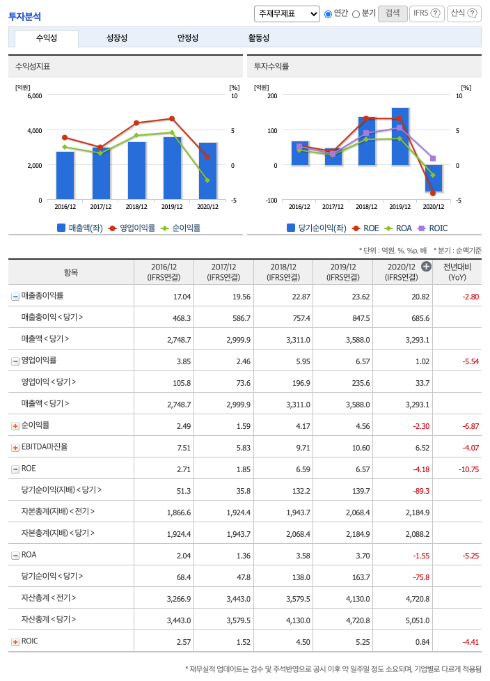 ROA(Return On Assets, 총자산순이익율, 경영자의 관점) : 2016년 약 2%, 2017년 약 1%, 2018년 약 3%, 2019년 약 3%, 2020년 약 -1%이고, 총자산이익율은 이상율(10%)보다 낮습니다.