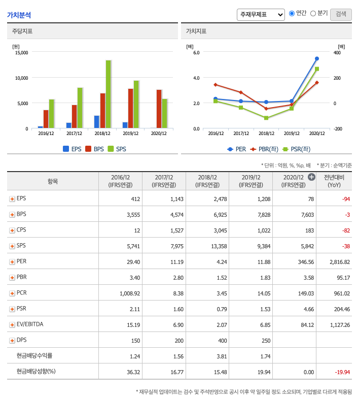 ROE(Return On Equity, 자기자본순이익율, 주주의 관점) : 2016년 약 12%, 2017년 약 29%, 2018년 약 44%, 2019년 약 17%, 2020년 약 1%이고, 자기자본순이익율은 이상율(10%)보다 낮습니다.