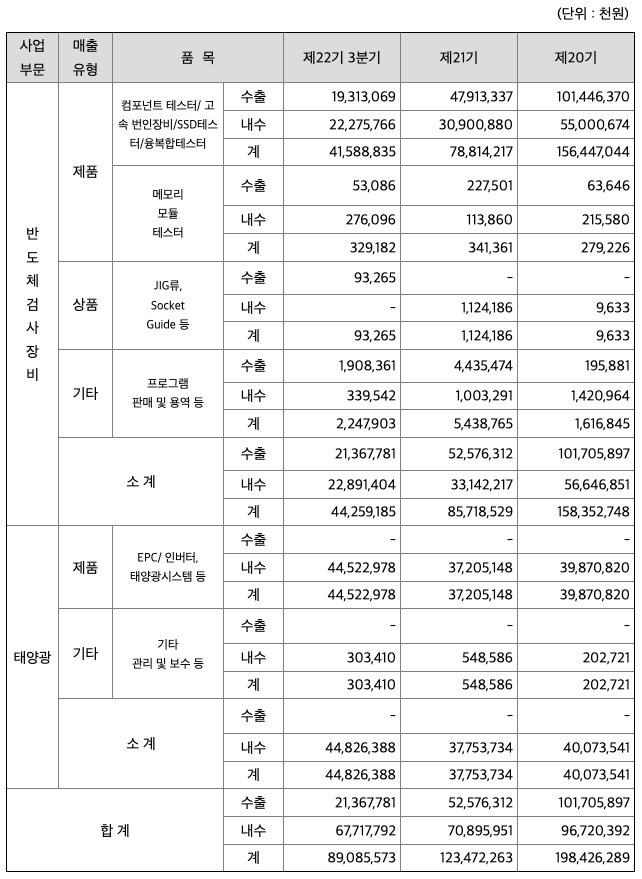 당사의 반도체사업 주요 제품은 크게 메모리컴포넌트테스터, 메모리모듈테스터, 고속번인테스터, 스토리지테스터(SSD테스터) 등으로 구분할 수 있으며, Green Energy사업으로는 태양광 EPC사업 등이 있습니다. 각 제품 품목별 매출액 및 전체 매출액에서 차지하는 비율은 다음과 같습니다.