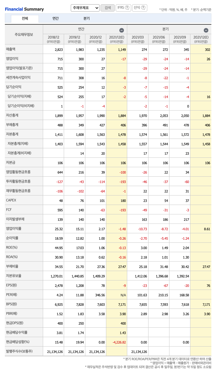 영업이익 : 2018년 715억원, 2019년 300억원, 2020년 27억원, 2021년 1,2,3분기 -67억원으로 전년동기대비 전자지속하였습니다. 2020년 분기별로 보면 4분기 83억원, 2021년 1분기 -29억원, 2분기 -24억원, 3분기 -14억원입니다.