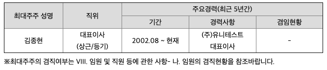 본 보고서 작성 기준일 현재 당사의 최대주주는 그 특수관계인의 지분율을 합하여 총20.68%를 보유하고 있습니다. 최대주주이자 대표이사인 김종현은 4,020,000주를 보유하여 지분율이 19.02%이고 그 특수관계인 주식은 총 10명으로 350,744주를 보유하여 지분율이 1.66%입니다. 당사의 최대주주 및 특수관계인의 주식소유 현황은 다음과 같습니다.