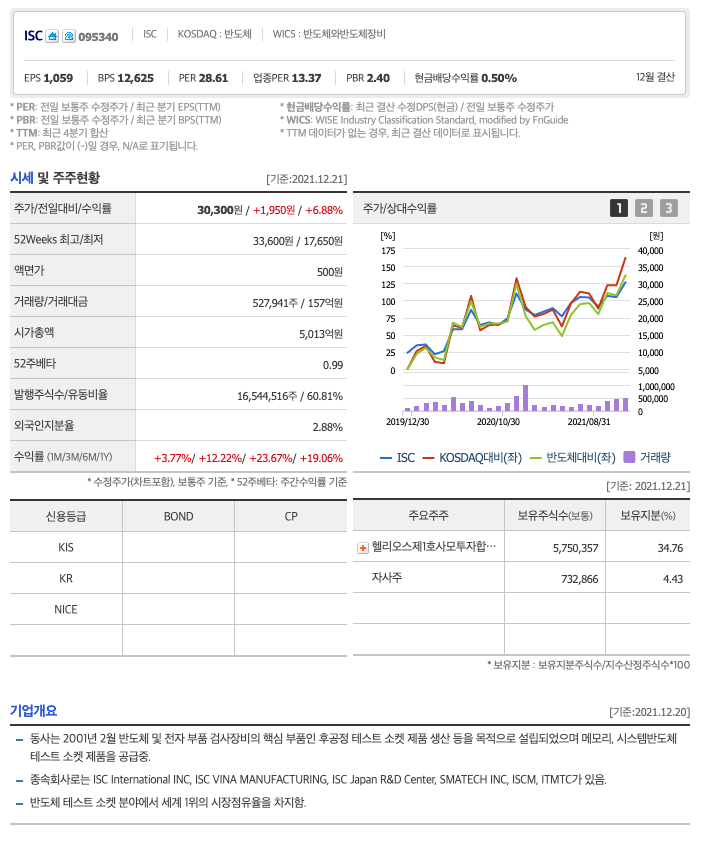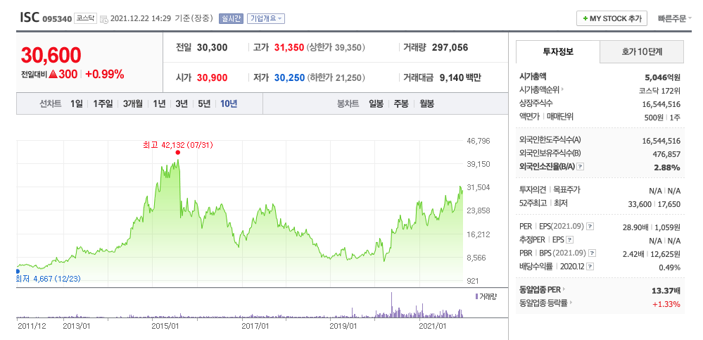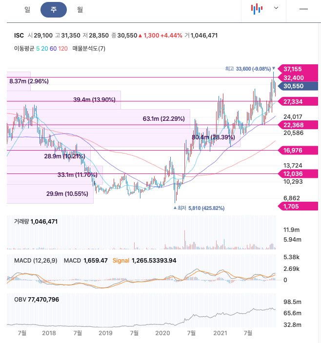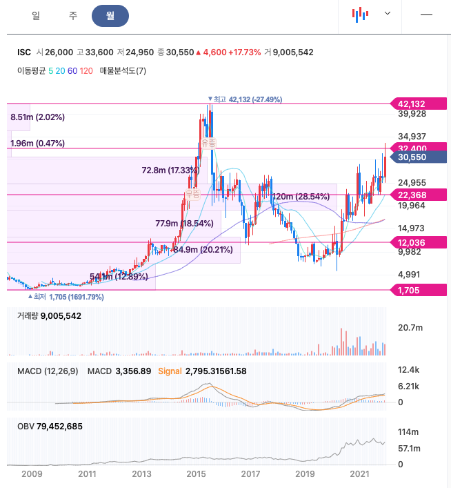 ISC의 주가는 21년 3월부터 주가가 반등하여 급등락을 오갔고, 12월 최고 33,600원을 찍고 조정을 받았습니다.