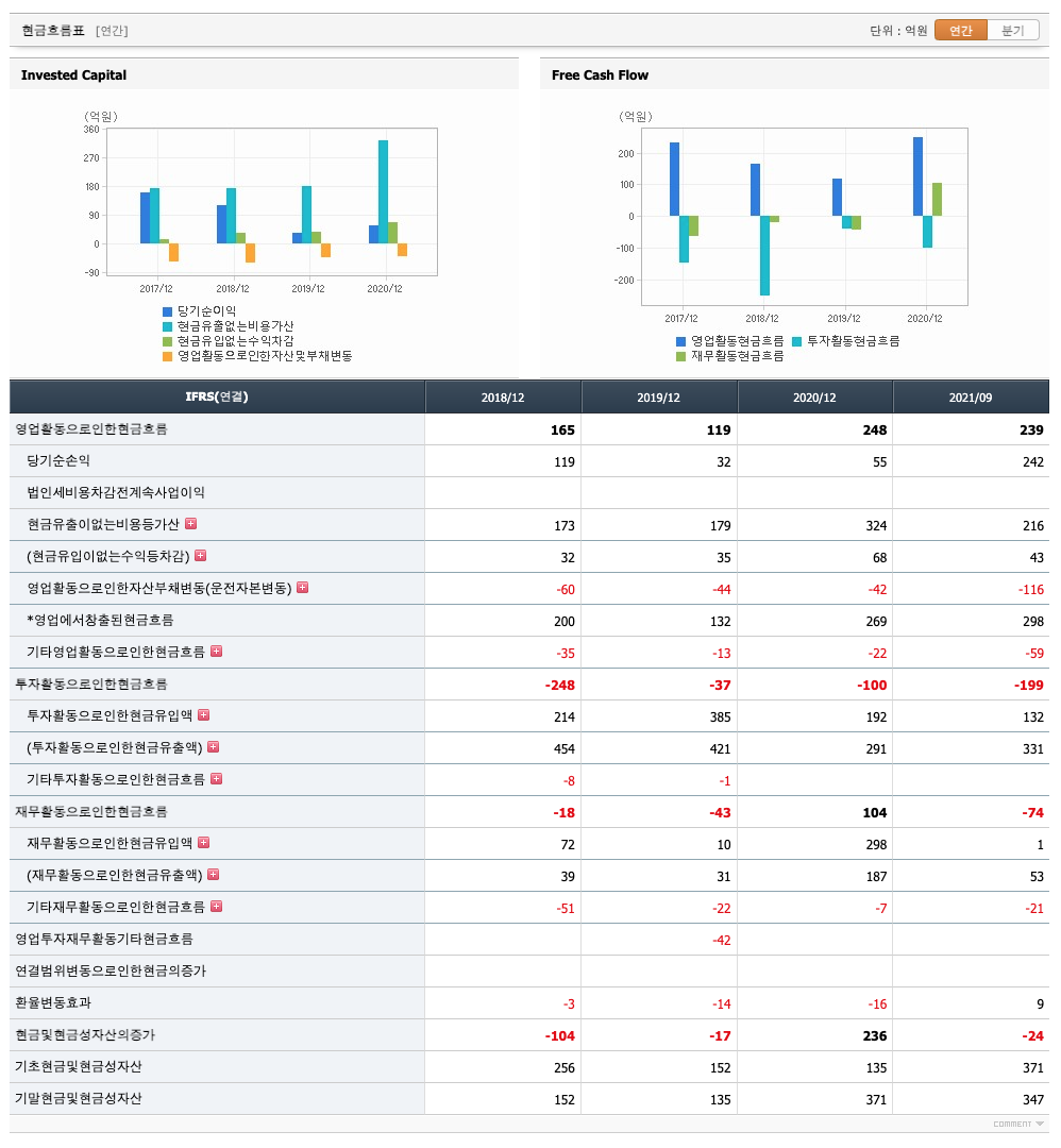 투자활동 현금흐름 : 2018년 -248억원, 2019년 -37억원, 2020년 -100억원, 2021년 1,2,3분기 -199억원으로 투자활동 현금흐름이 원활합니다.