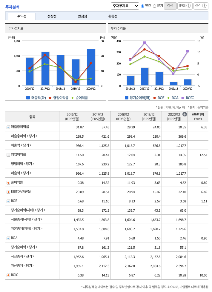 ROA(Return On Assets, 총자산순이익율, 경영자의 관점) : 2016년 약 4%, 2017년 약 7%, 2018년 약 5%, 2019년 약 1%, 2020년 약 2%이고, 총자산이익율은 이상율(10%)보다 낮습니다.