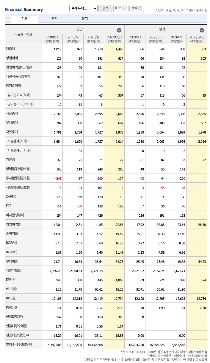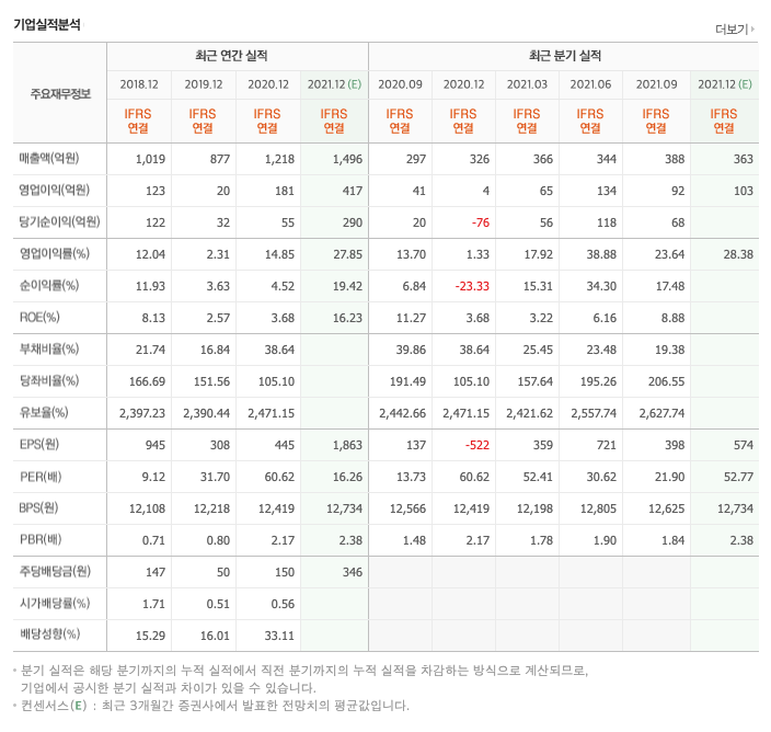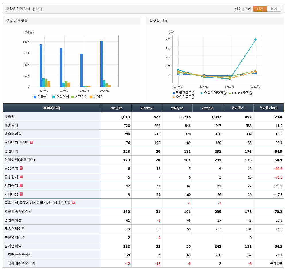 매출액 : 2018년 1019억원, 2019년 877억원, 2020년 1218억원, 2021년 1,2,3분기 1097억원으로 전년동기대비 증가하였습니다. 2021년 3분기는 전년동기대비 23% 증가하였습니다. 2020년 분기별로 보면 4분기 325억원, 2021년 1분기 366억원, 2분기 344억원, 3분기 388억원입니다.