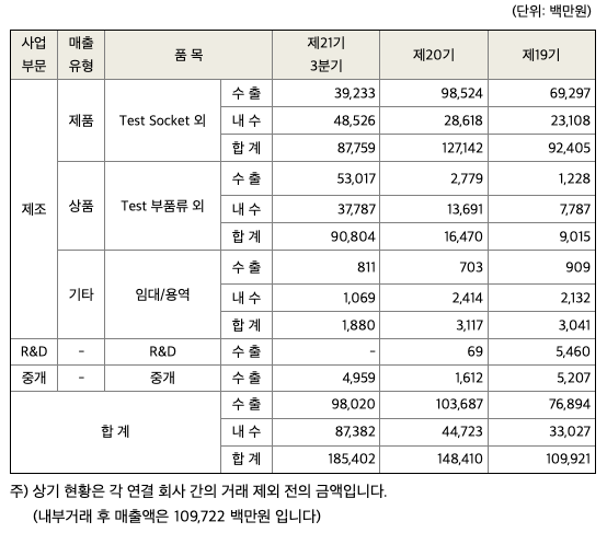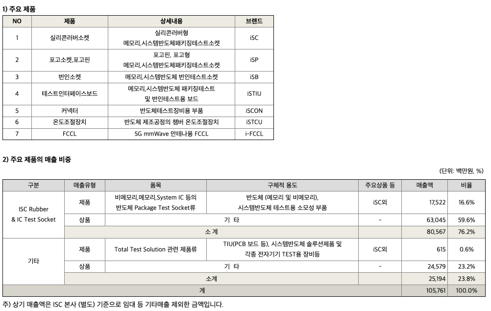 당사의 주력사업은 반도체 IC와 IT 디바이스등을 테스트하는 반도체테스트솔루션 사업입니다. 현재 신 사업으로 mmWave(28GHz) 5G 안테나용 FCCL 제조를 위한 신사업을 추진 중에 있습니다. 각 사업의 개요는 다음과 같습니다.