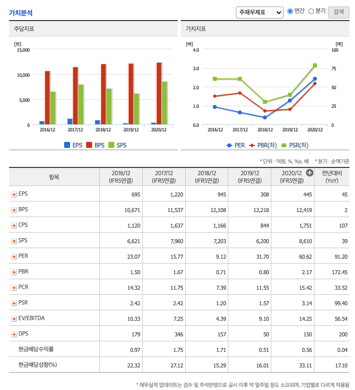 DPS(Dividend Per Share의 약자, 총배당금을 총주식발생수로 나눈 것, 한 주당 얼만큼의 배당금을 받을 수 있는지 알 수 있는 지표, DPS가 높을 수록 배당금이 많은 것임) : 2016년 179원, 2017년 346원, 2018년 157원, 2019년 50원, 2020년 150원으로 전년동기 증가하였습니다.
