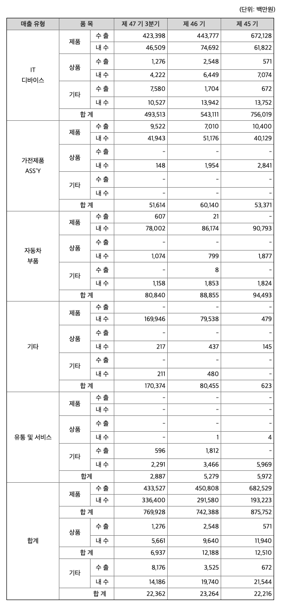 당사는 IT 디바이스, 가전제품 ASS'Y 및 자동차부품 등을 생산하고 있으며, 각 제품별 매출액 및 총 매출액에서 차지하는 비율은 다음과 같습니다.
