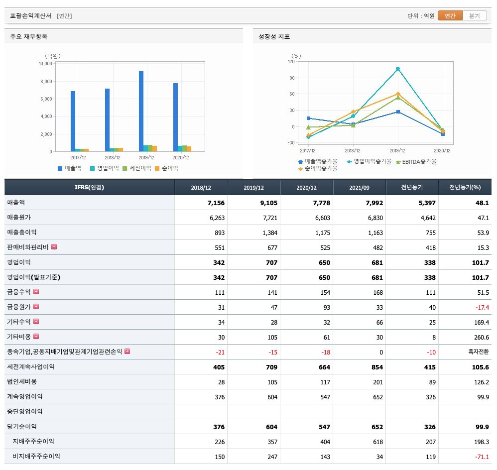 매출액 : 2018년 7156억원, 2019년 9105억원, 2020년 7778억원, 2021년 1,2,3분기 5397억원으로 전년동기대비 증가하였습니다. 2021년 3분기는 전년동기대비 48.1% 증가하였습니다. 2020년 분기별로 보면 4분기 2381억원, 2021년 1분기 2871억원, 2분기 2097억원, 3분기 3024억원입니다.