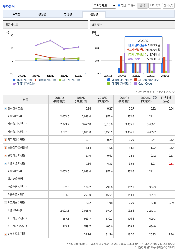**매출채권회전일수(=돈을 받는 순환일 수, 낮을 수록 좋습니다) 약 118일, 재고자산회전일수(=재고자산 빠지는 일수, 높을 수록 좋습니다) 약 126일, 매입채무회전일수(=돈을 늦게 줘도 되는 일 수, 높을 수록 좋습니다) 약 17일이고, Cash Cycle(현금회전율, 낮을 수록 좋습니다) 약 228일로 현금운영입니다.