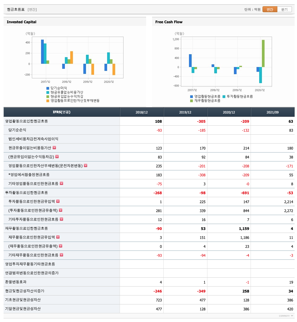 영업활동 현금흐름 : 2018년 108억원, 2019년 -305억원, 2020년 -209억원, 2021년 1,2,3분기 63억원으로 2018년과 2021년 3분기의 영업활동 현금흐름이 원활합니다.