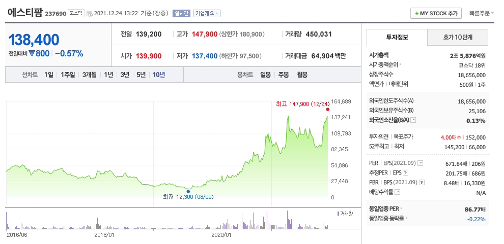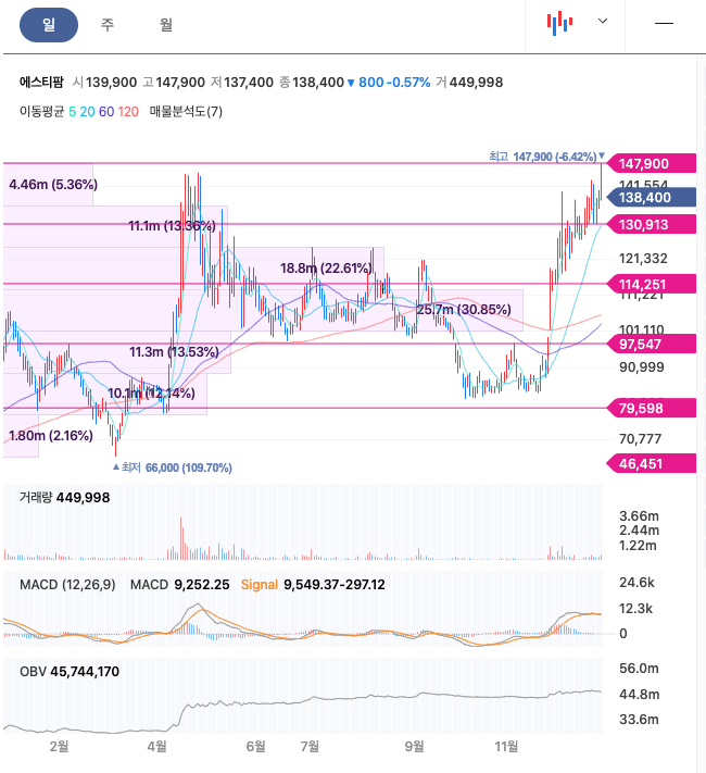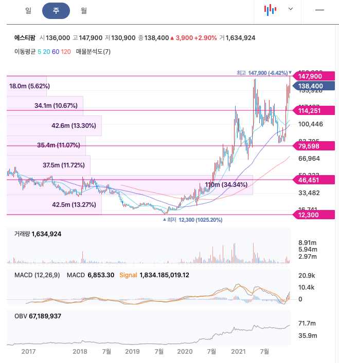 에스티팜의 주가는 21년 4월 급등한뒤 조정을 받고, 다시 12월에 재금등하여 최고 147,900원을 찍었습니다.