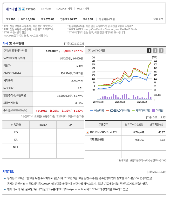 | 에스티팜 | 139,100원 | 112,575원 | 112,611원 | 117,386원 |