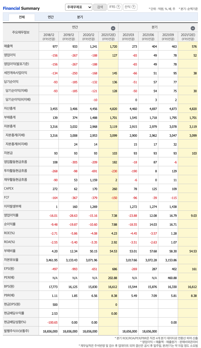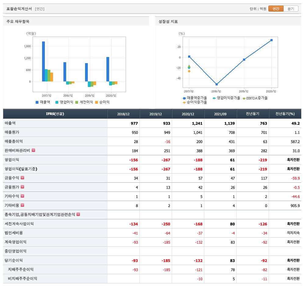 매출액 : 2018년 977억원, 2019년 933억원, 2020년 1241억원, 2021년 1,2,3분기 1139억원으로 전년동기대비 감소하였습니다. 2021년 3분기는 전년동기대비 49.2% 증가하였습니다. 2020년 분기별로 보면 4분기 478억원, 2021년 1분기 273억원, 2분기 404억원, 3분기 463억원입니다.