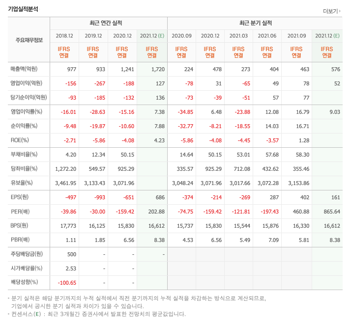 영업이익 : 2018년 -156억원, 2019년 -267억원, 2020년 -188억원, 2021년 1,2,3분기 66억원으로 전년동기대비 흑자전환하였습니다. 2020년 분기별로 보면 4분기 31억원, 2021년 1분기 -65억원, 2분기 49억원, 3분기 78억원입니다.