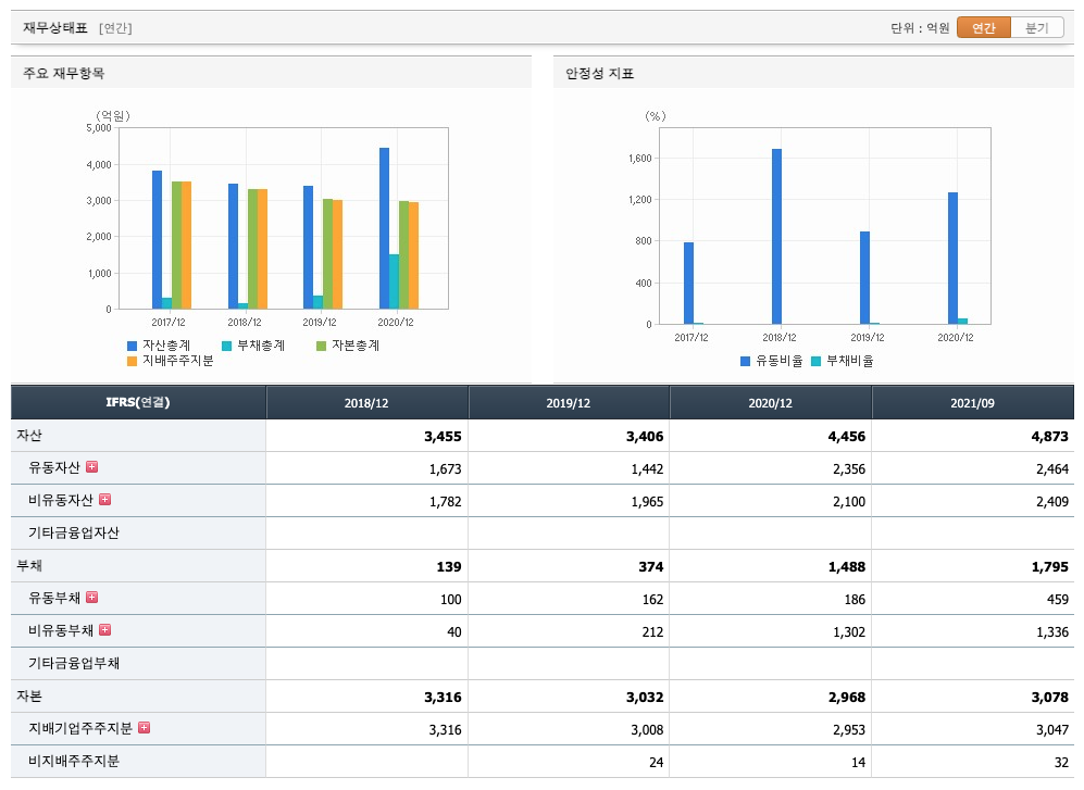 투자활동 현금흐름 : 2018년 -268억원, 2019년 -98억원, 2020년 -691억원, 2021년 1,2,3분기 -53억원으로 투자활동 현금흐름이 원활합니다.