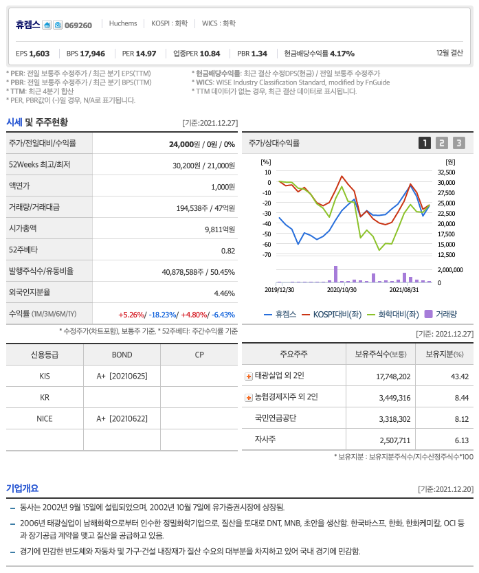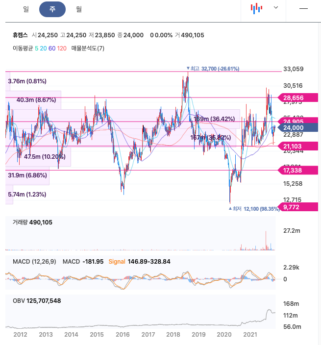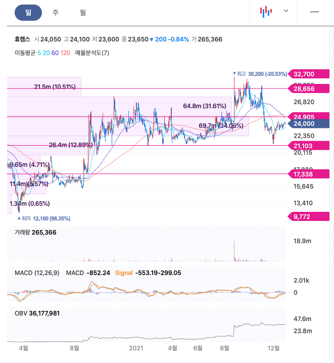 | 휴켐스 | 24,000원 | 26,202원 | 25,492원 | 25,139원 |
