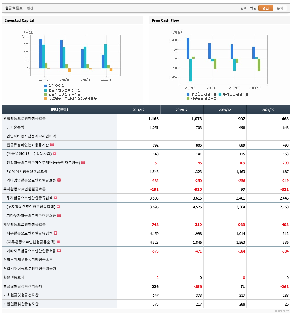 재무활동 현금흐름 : 2018년 -748억원, 2019년 -319억원, 2020년 -933억원, 2021년 1,2,3분기 -408억원으로 재무활동 현금흐름이 원활합니다.