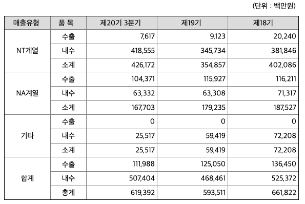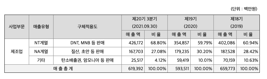 당사는 제조업과 부동산업 2개의 사업부문을 가지고 있습니다. 다만, 보고서 작성일 현재 부동산업 부문에서의 매출인식 사항은 없음으로 정밀화학산업 중심의 제조업에서 매출액의 100% 인식하고 있습니다. 당사의 제조시설은 여수산업단지에 위치하며, 주요 원재료로 암모니아, 톨루엔, 벤젠 등을 남해화학, GS칼텍스, OCI 등으로부터 매입하여 사용합니다. 당사는 DNT, MNB를 폴리우레탄 재료인 NT제품으로 생산/판매하고 있으며 21년 3분기 매출비중은 약 69%입니다. 암모니아가 주원료인 희질산, 농질산, 초안을 NA계열제품으로 생산/판매하고 있으며 해당제품은 21년 3분기 매출액의 27%를 차지합니다. 그 외에 암모니아 상품, 요소수 상품 및 온실가스 저감을 통해 획득하는 탄소배출권을 국내 배출권 시장에 판매하고 있습니다. 당사의 21년 3분기 발생매출 중 내수 및 수출의 비중은 82:18입니다.