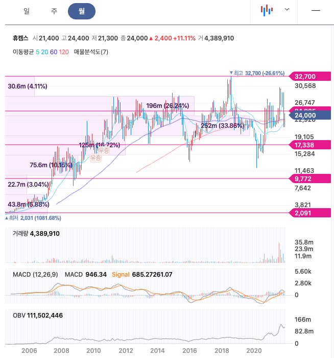 휴켐스의 주가는 20년 8월에 급등하였고, 이후 보합세를 이어가다가 21년 8월 최고 30,200원을 찍고 조정을 받았습니다.