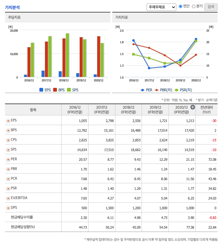 DPS(Dividend Per Share의 약자, 총배당금을 총주식발생수로 나눈 것, 한 주당 얼만큼의 배당금을 받을 수 있는지 알 수 있는 지표, DPS가 높을 수록 배당금이 많은 것임) : 2016년 500원, 2017년 1500원, 2018년 1200원, 2019년 1000원, 2020년 1000원으로 전년동기 동결입니다.