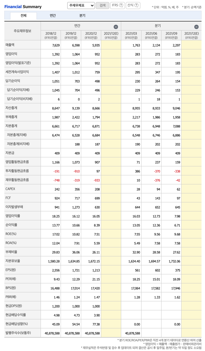FCF(미래현금흐름) : 2018년 924억원, 2019년 717억원, 2020년 699억원으로 미래현금흐름이 좋습니다.