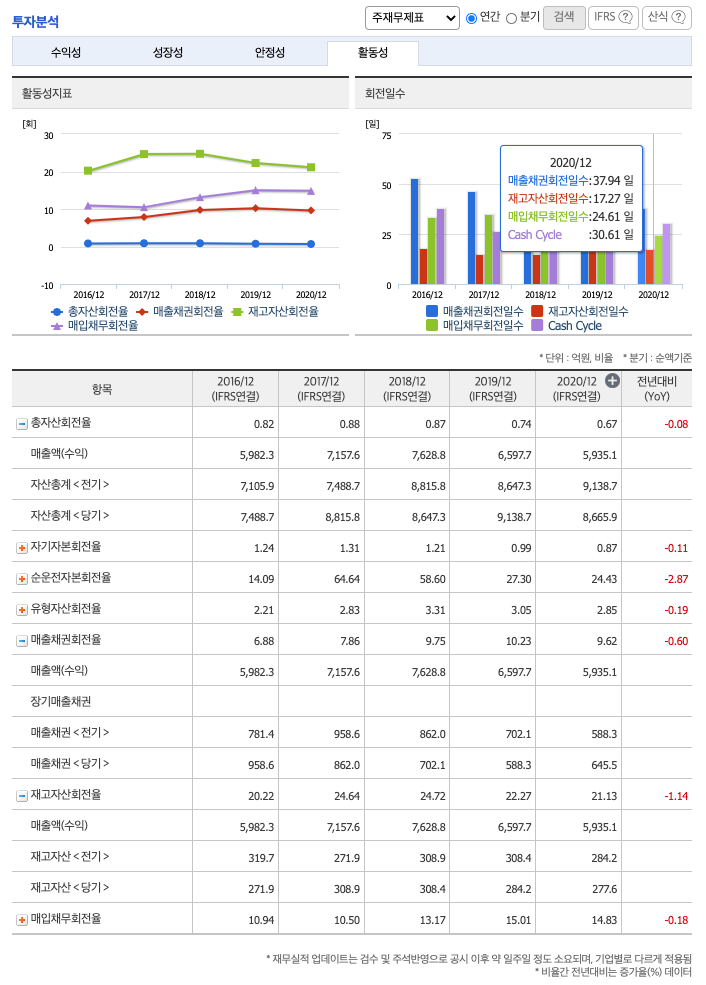 재고자산회전율(높을 수록 좋습니다) : 2018년 약 308억원, 2019년 약 284억원, 2020년 약 277억원이고, 회전율은 2018년 약 24%, 2019년 약 22%, 2020년 약 21%로 안정적입니다.