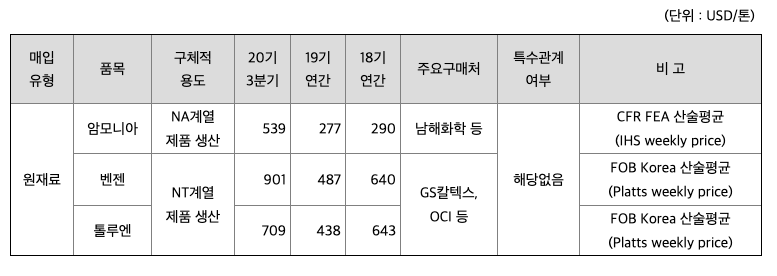 당사의 주요 제품 생산에 사용되는 주요 원재료는 암모니아, 톨루엔, 벤젠 등이며 해당 원재료 가격변동추이, 주요 매입처, 해당 매입처와 회사와의 특수관계 여부 등은 다음과 같습니다.