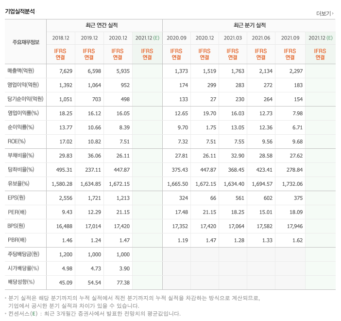 영업이익 : 2018년 1392억원, 2019년 1064억원, 2020년 952억원, 2021년 1,2,3분기 737억원으로 전년동기대비 증가하였습니다. 2021년 3분기는 전년동기대비 12.9% 하였습니다. 2020년 분기별로 보면 4분기 299억원, 2021년 1분기 283억원, 2분기 272억원, 3분기 183억원입니다.
