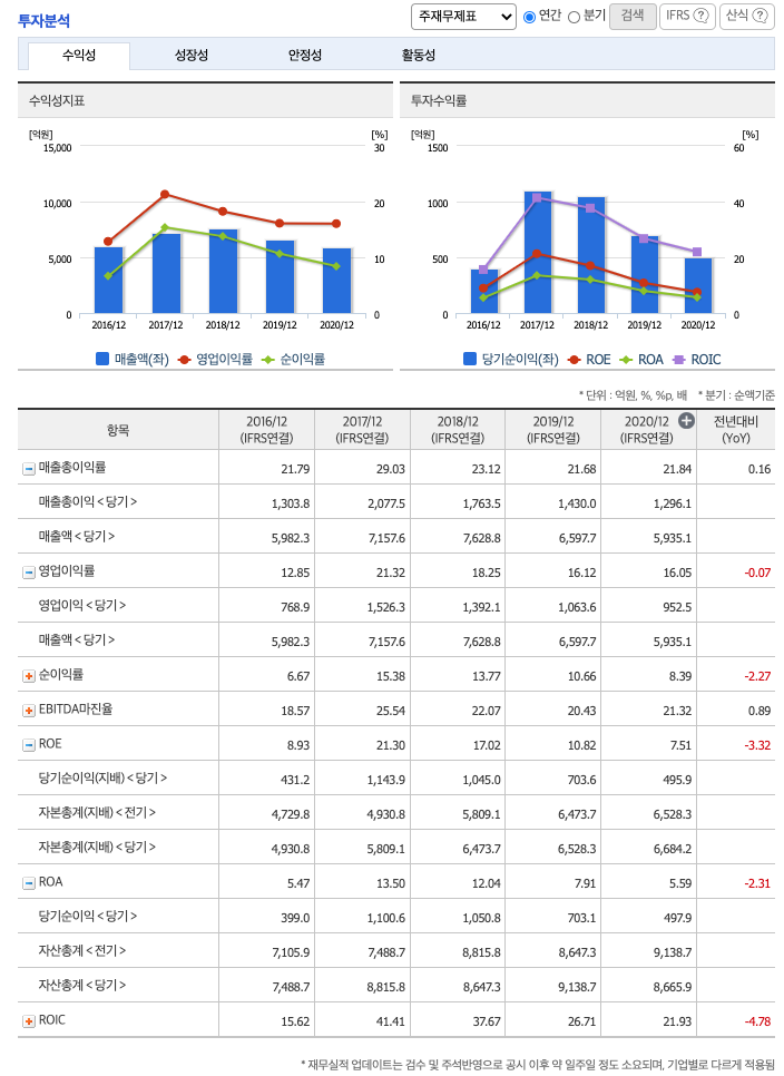 ROE(Return On Equity, 자기자본순이익율, 주주의 관점) : 2016년 약 8%, 2017년 약 21%, 2018년 약 17%, 2019년 약 10%, 2020년 약 7%이고, 자기자본순이익율은 이상율(10%)보다 낮습니다.