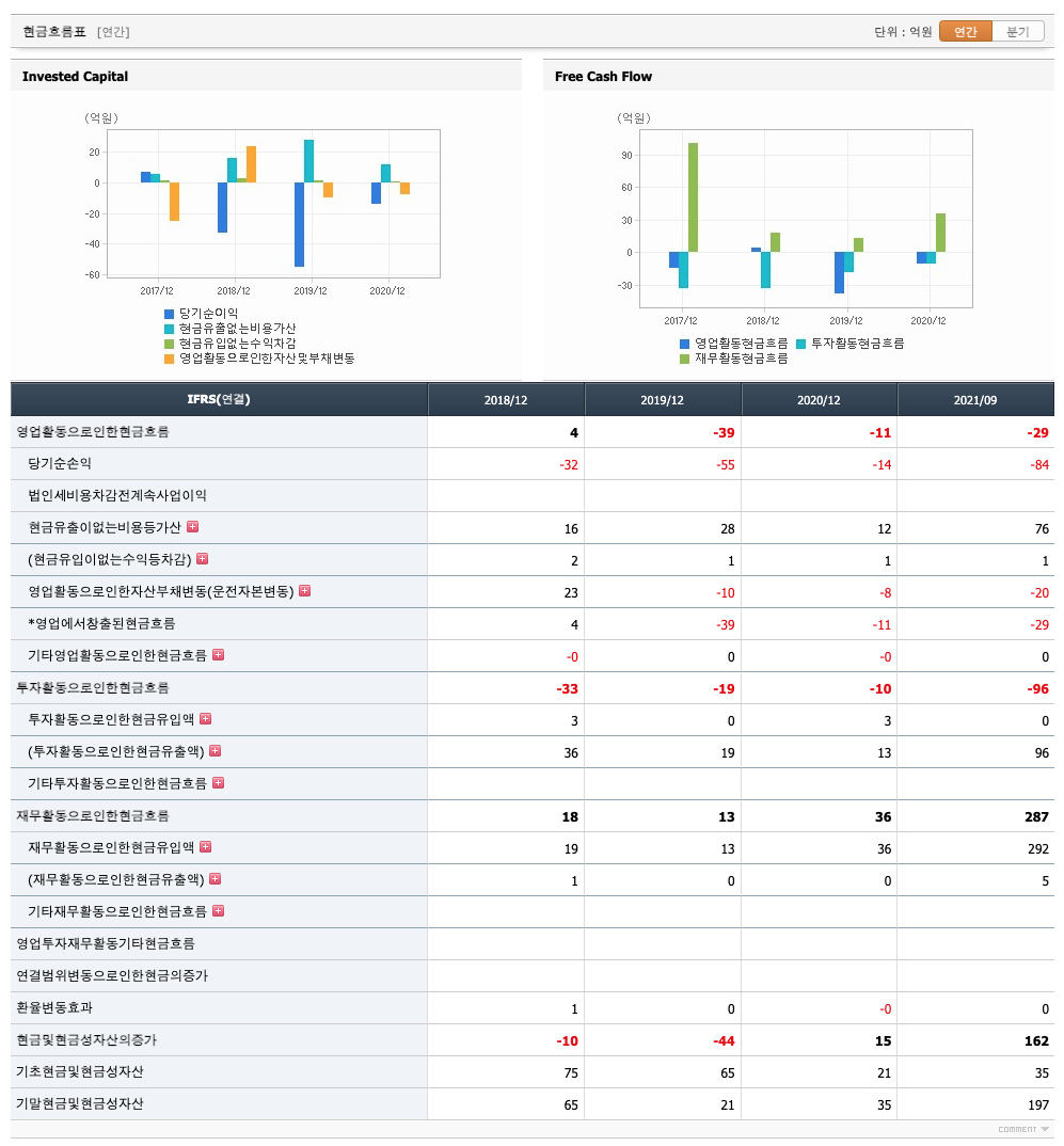 영업활동 현금흐름 : 2018년 4억원, 2019년 -39억원, 2020년 -11억원, 2021년 1,2,3분기 -29억원으로 2019년이후 영업활동 현금흐름이 원활지 못합니다.