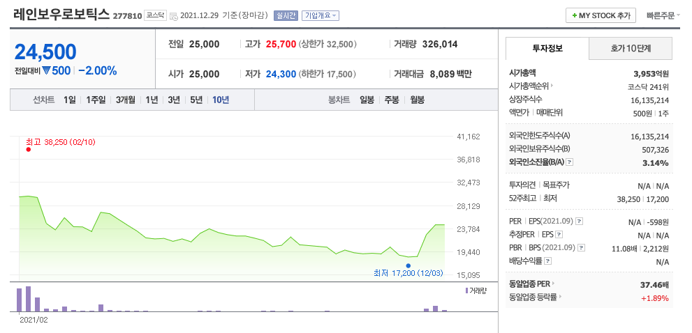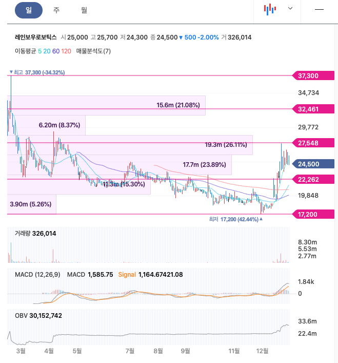 | 레인보우로보틱스 | 24,500원 | 23,384원 | 22,681원 | 24,025원 |