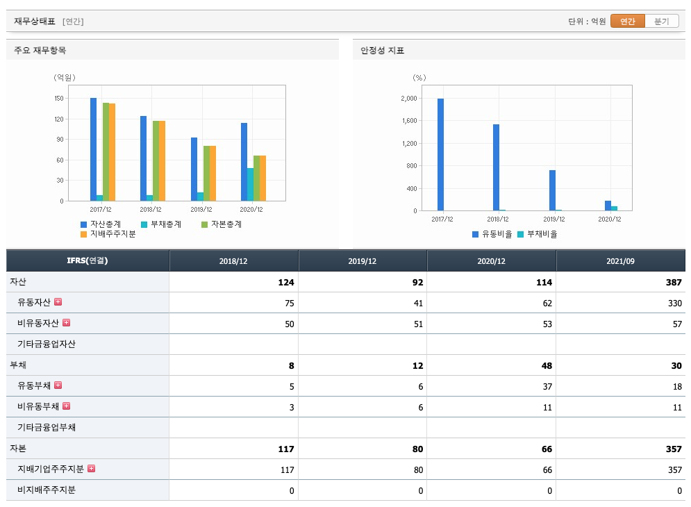자산은 2018년 124억원, 2019년 92억원, 2020년 114억원, 2021년 1,2,3분기 387억원으로 증가 하였습니다.