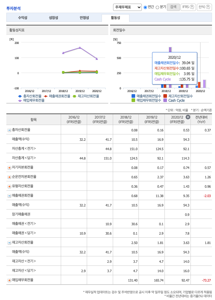 재고자산회전율(높을 수록 좋습니다) : 2018년 약 4.7억원, 2019년 약 14억원, 2020년 약 16억원이고, 회전율은 2018년 약 4.7%, 2019년 약 14%, 2020년 약 16%로 안정적입니다.