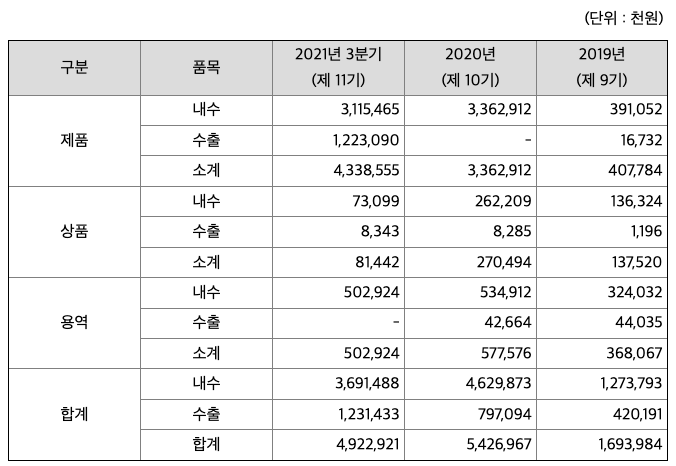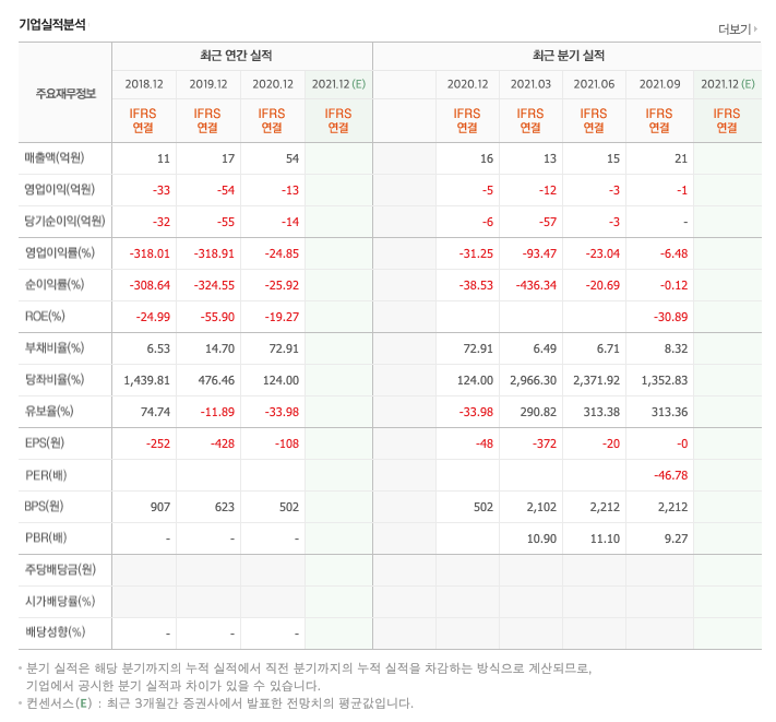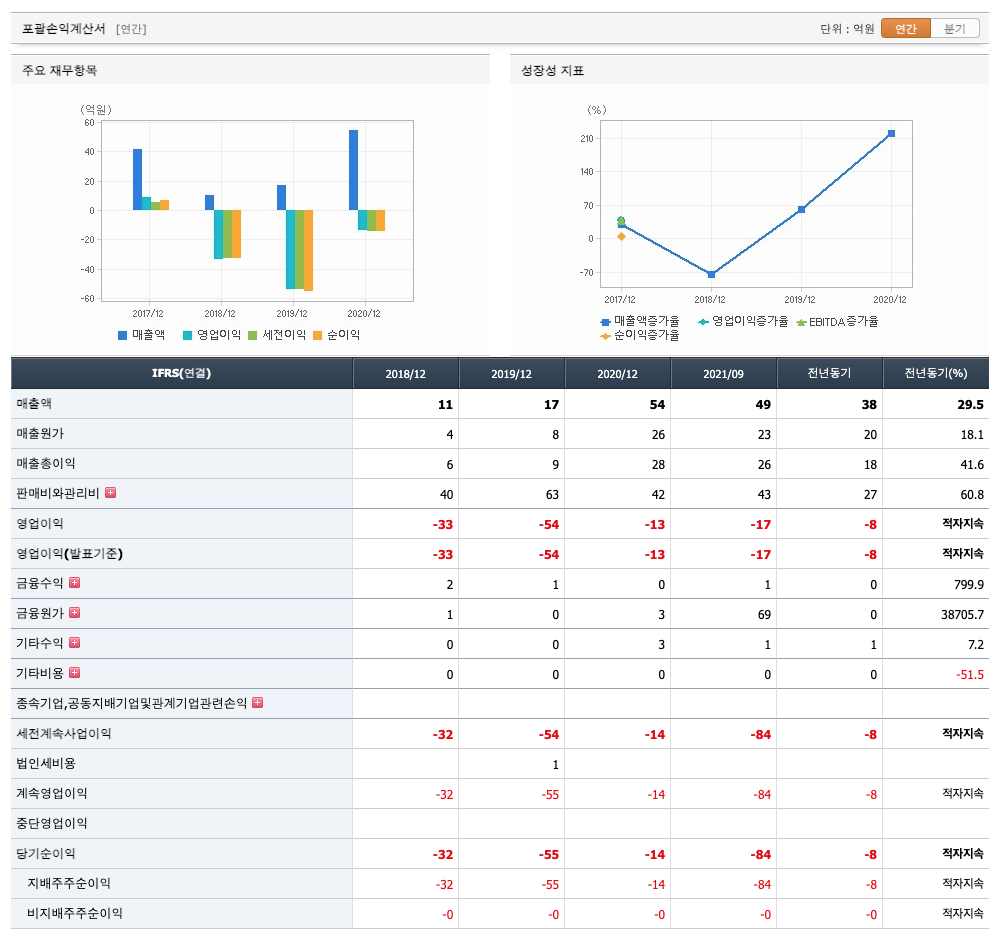 매출액 : 2018년 11억원, 2019년 17억원, 2020년 54억원, 2021년 1,2,3분기 49억원으로 전년동기대비 증가하였습니다. 2021년 3분기는 전년동기대비 29.5% 증가하였습니다. 2020년 분기별로 보면 4분기 16억원, 2021년 1분기 13억원, 2분기 15억원, 3분기 21억원입니다.
