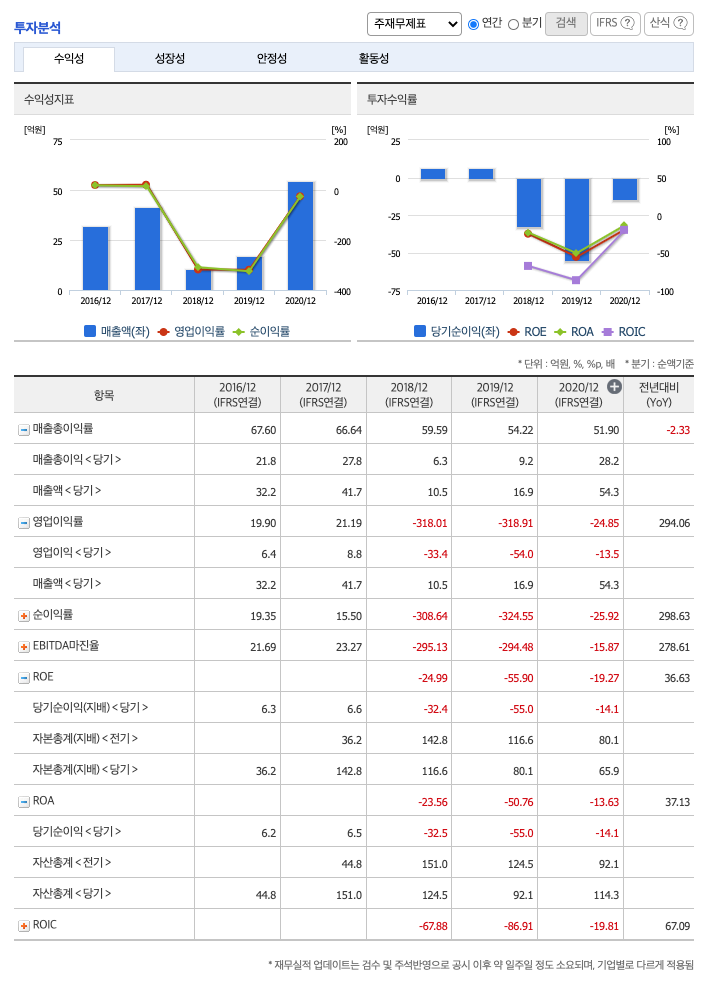 ROA(Return On Assets, 총자산순이익율, 경영자의 관점) : 2018년 약 -23%, 2019년 약 -50%, 2020년 약 -14%이고, 총자산이익율은 이상율(10%)보다 낮습니다.