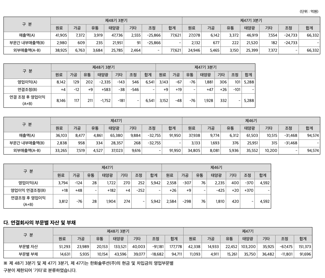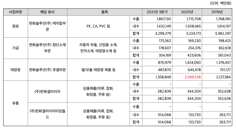 당사와 종속기업은 연결실체를 사업부문별로 사업의 특성에 따라 원료부문(한화솔루션(주) 케미칼부문, Hanwha Chemical (Ningbo) Co. Ltd 등), 가공부문(한화솔루션(주) 첨단소재부문, 등), 유통부문(한화솔루션(주) 갤러리아부문, (주)한화갤러리아타임월드 등), 태양광부문(한화솔루션(주) 큐셀부문, Hanwha Q CELLS Co.,Ltd 등), 기타부문((주)한화도시개발 등)으로 구성되어 있습니다.