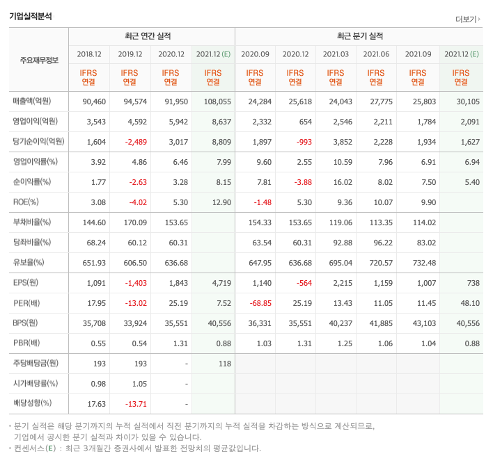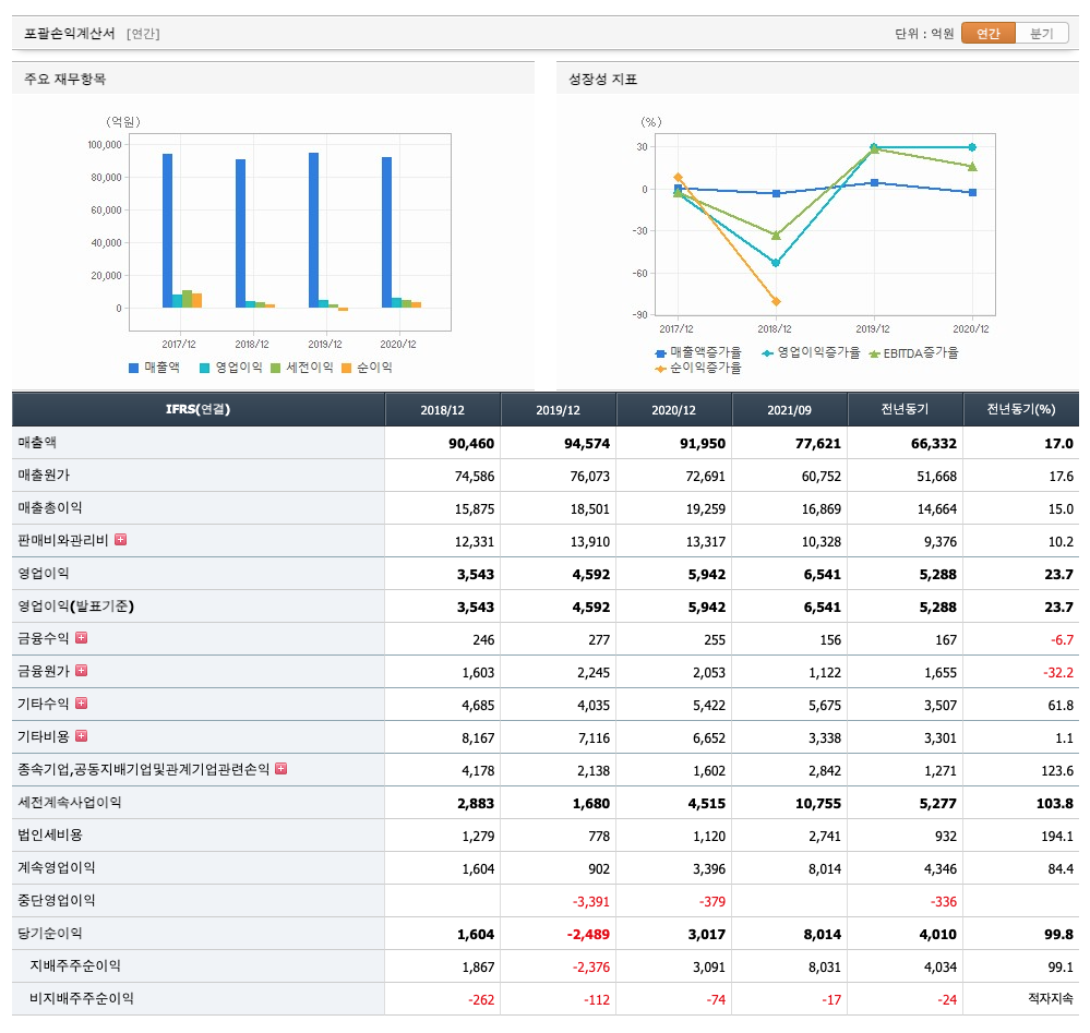 매출액 : 2018년 90,460억원, 2019년 94,574억원, 2020년 91,950억원, 2021년 1,2,3분기 77,621억원으로 전년동기대비 증가하였습니다. 2021년 3분기는 전년동기대비 17% 증가하였습니다. 2020년 분기별로 보면 4분기 25,618억원, 2021년 1분기 24,043억원, 2분기 27,775억원, 3분기 25,803억원입니다.