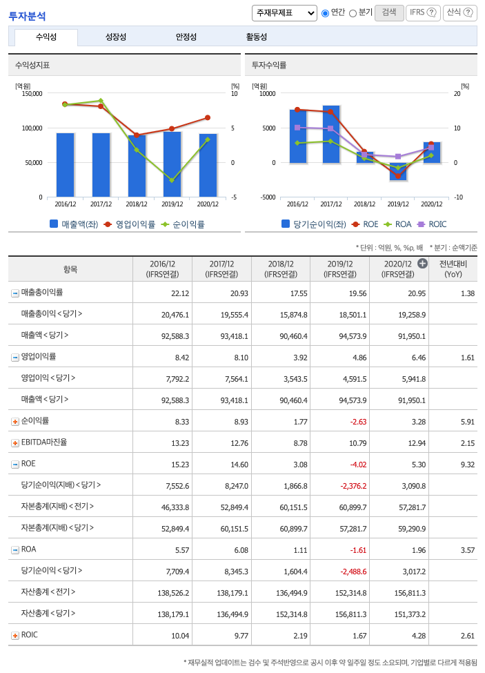 ROE(Return On Equity, 자기자본순이익율, 주주의 관점) : 2016년 약 15%, 2017년 약 14%, 2018년 약 3%, 2019년 약 -4%, 2020년 약 5%이고, 자기자본순이익율은 이상율(10%)보다 낮습니다.