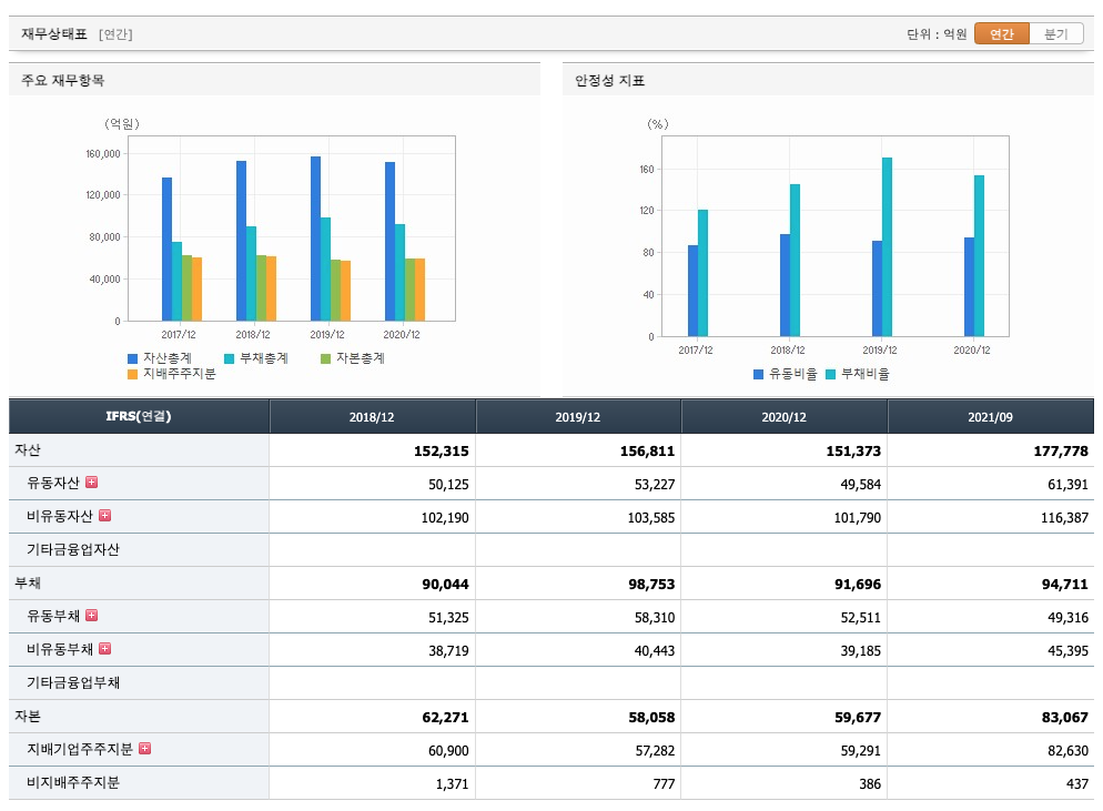 자산은 2018년 152,315억원, 2019년 156,811억원, 2020년 151,373억원, 2021년 1,2,3분기 177,778억원으로 증가 하였습니다.