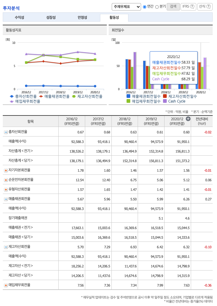 매출채권회전율(높을 수록 좋습니다) : 2018년 약 16,518억원, 2019년 약 15,044억원, 2020년 약 14,333억원이고, 회전율은 2018년 약 5%, 2019년 약 5%, 2020년 약 6%로 안정적입니다.