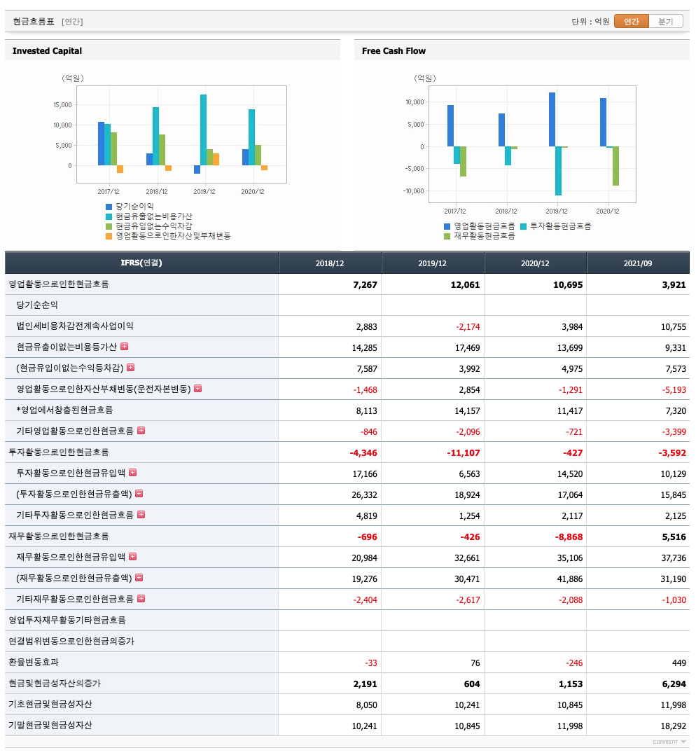 영업활동 현금흐름 : 2018년 7267억원, 2019년 12,061억원, 2020년 10,695억원, 2021년 1,2,3분기 3921억원으로 영업활동 현금흐름이 원활합니다.