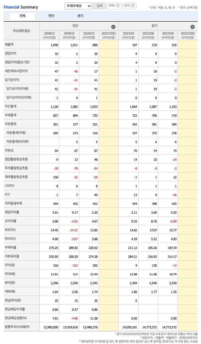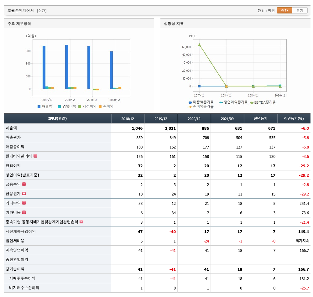 매출액 : 2018년 1046억원, 2019년 1011억원, 2020년 886억원, 2021년 1,2,3분기 631억원으로 전년동기대비 감소하였습니다. 2021년 3분기는 전년동기대비 -6% 감소하였습니다. 2020년 분기별로 보면 4분기 214억원, 2021년 1분기 197억원, 2분기 219억원, 3분기 227억원입니다.