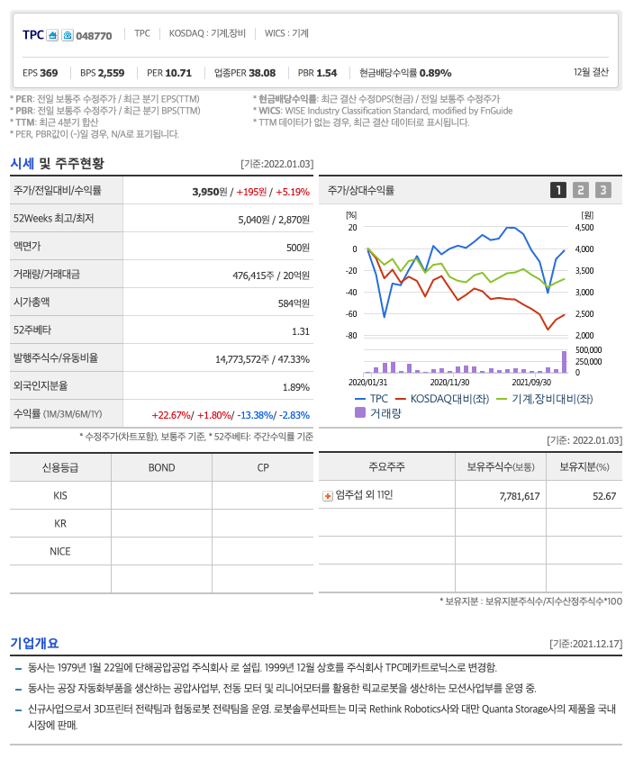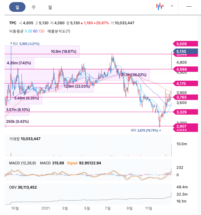 TPC의 주가는 20년 8월 반등하여 9월 최고 5,300원을 찍고 보합중에 있다가 조정을 받았고 다시 반등중에 있습니다.