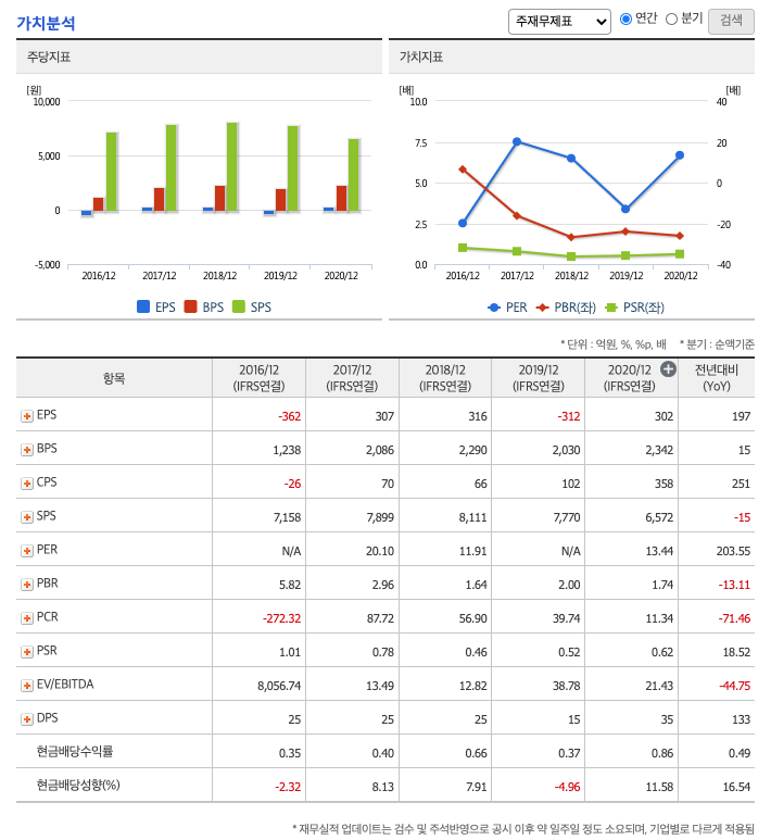 DPS(Dividend Per Share의 약자, 총배당금을 총주식발생수로 나눈 것, 한 주당 얼만큼의 배당금을 받을 수 있는지 알 수 있는 지표, DPS가 높을 수록 배당금이 많은 것임) : 2016년 25원, 2017년 25원, 2018년 25원, 2019년 15원, 2020년 35원으로 전년동기 증가하였습니다.