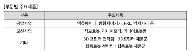 당사는 본사를 거점으로 공압 및 모션사업 부문 및 최근 3D프린터 사업에 진출한 종합 자동화 시스템 기업입니다. 사업군별로 보면 공압 액츄에이터와 방향제어기기등 공장자동화 부품을 생산/판매하는 공압사업부와 전동 서보모터 및 리니어모터를 활용한 직교로봇, 리니어 로봇등을 생산/판매하는 모션 사업부를 운영중에 있으며, 3D프린터 전략팀 및 협동로봇 전략팀을 신설하여 관련 제품 생산/판매를 하고 있습니다.