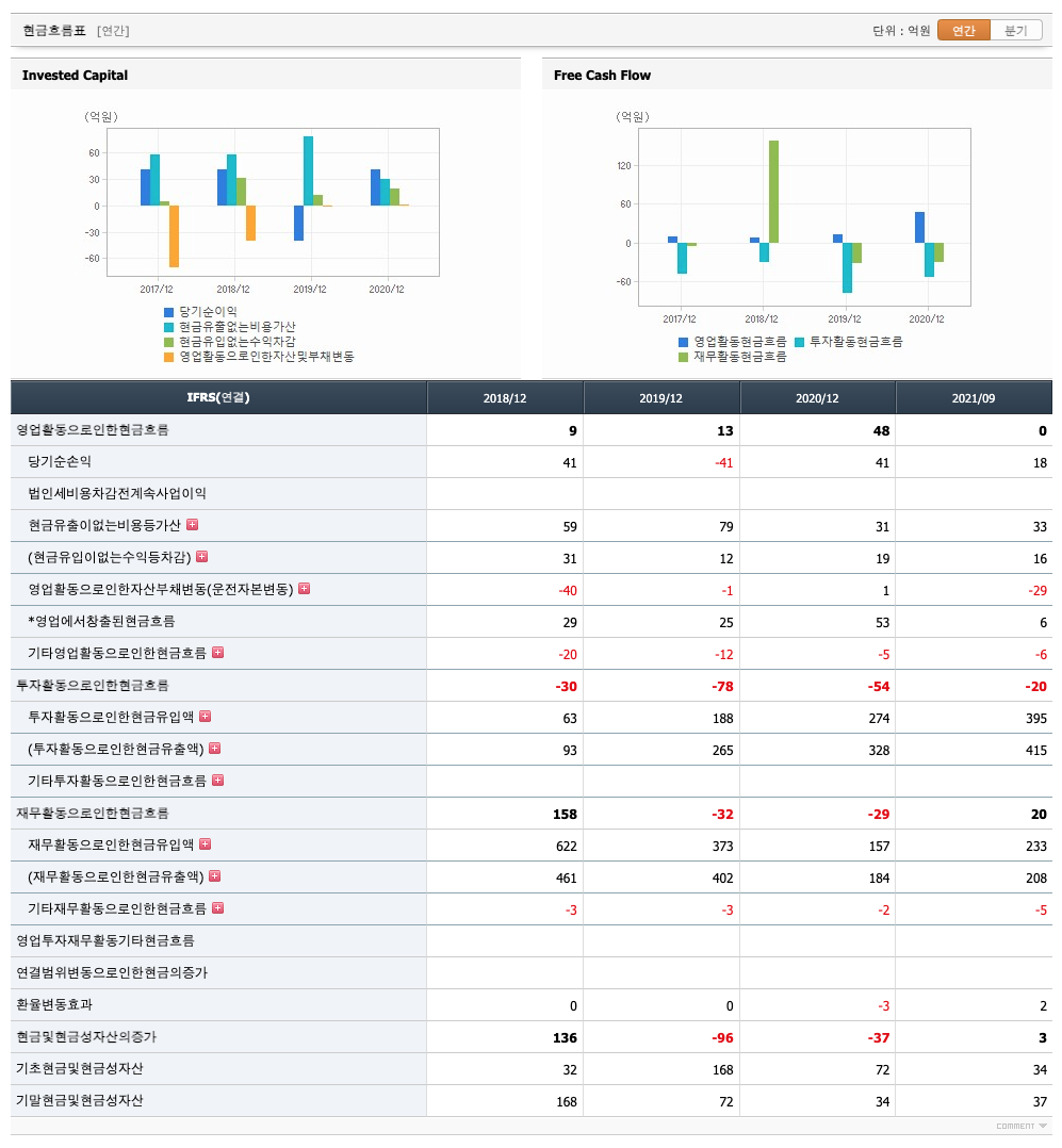재무활동 현금흐름 : 2018년 158억원, 2019년 -32억원, 2020년 -29억원, 2021년 1,2,3분기 20억원으로 2018년과 2021년 3분기의 재무활동 현금흐름은 플러스, 2019년과 2020년의 재무활동 현금흐름은 마이너스입니다.